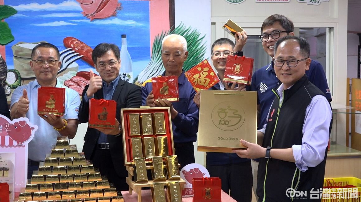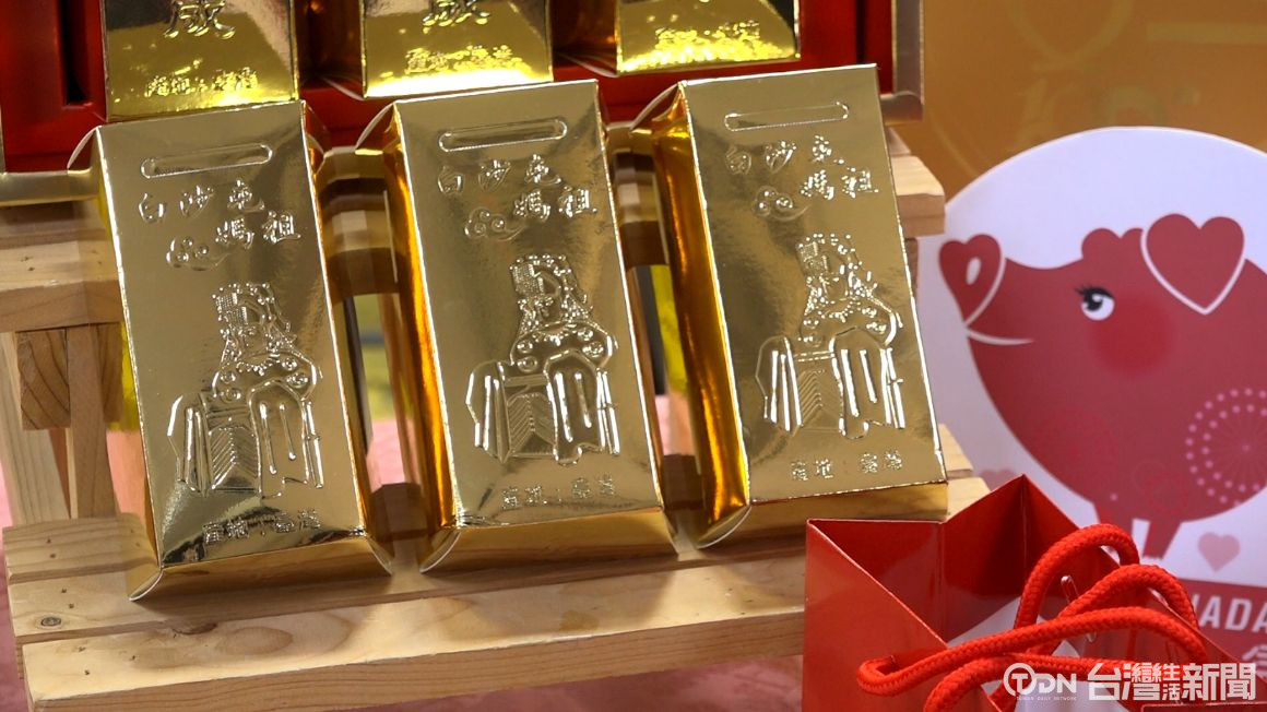 一塊塊金磚層層交疊,閃閃發光,上頭還印有白沙屯媽祖的聖像,相當吸睛,這款由大安區農會,最新推出的「白沙屯媽祖金磚米」,以優質稻米結合宗教文化,打造出文創商品。