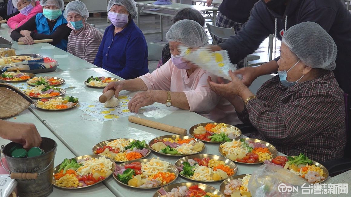 ▲長輩照著老師的指導,要來將劍蝦一個一個放在披薩上面。/記者 陳佳昇 攝。