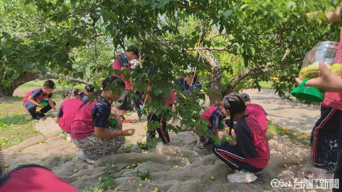 ▲學童撿拾掉落青梅/記者 范宏坤 攝