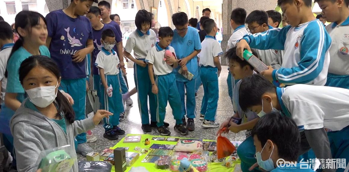 ▲大里區瑞城國小這天舉辦一場跳蚤市集活動,小朋友與家長會現場擺出文具、玩偶等物品/記者 賴秋峰攝