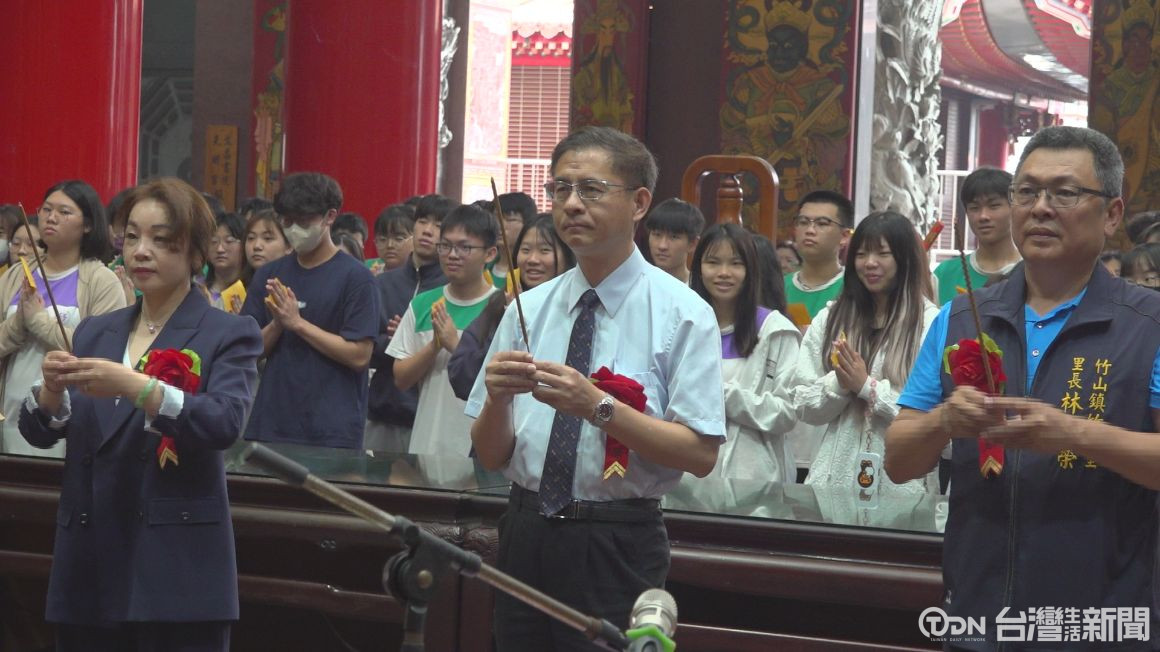 ▲竹山高中師生來到克明宮祭拜孔子祈福考試。/記者 何羿勳 攝