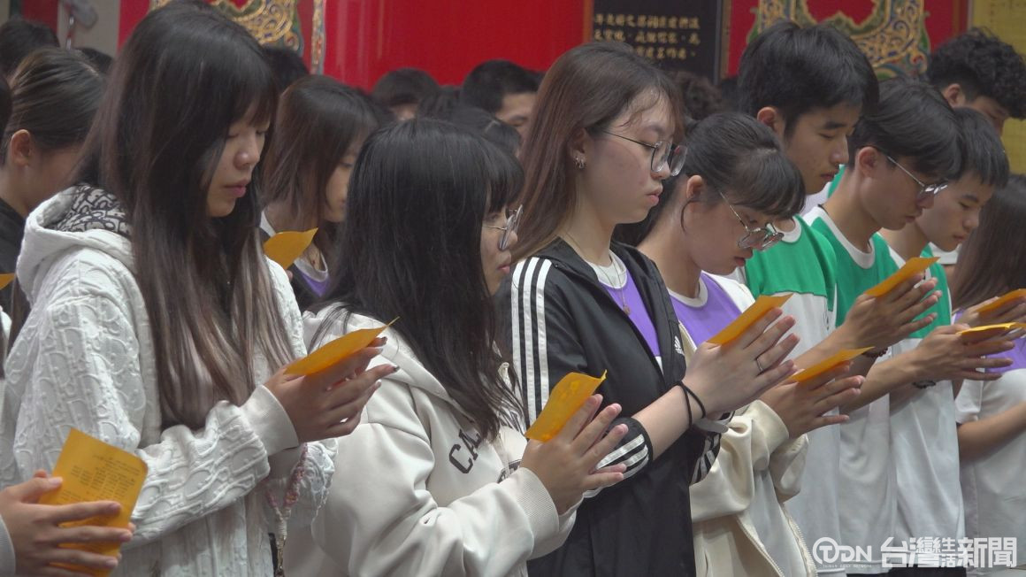 ▲學生們誠心祈禱,祝考試拚得好成績。/記者 何羿勳 攝