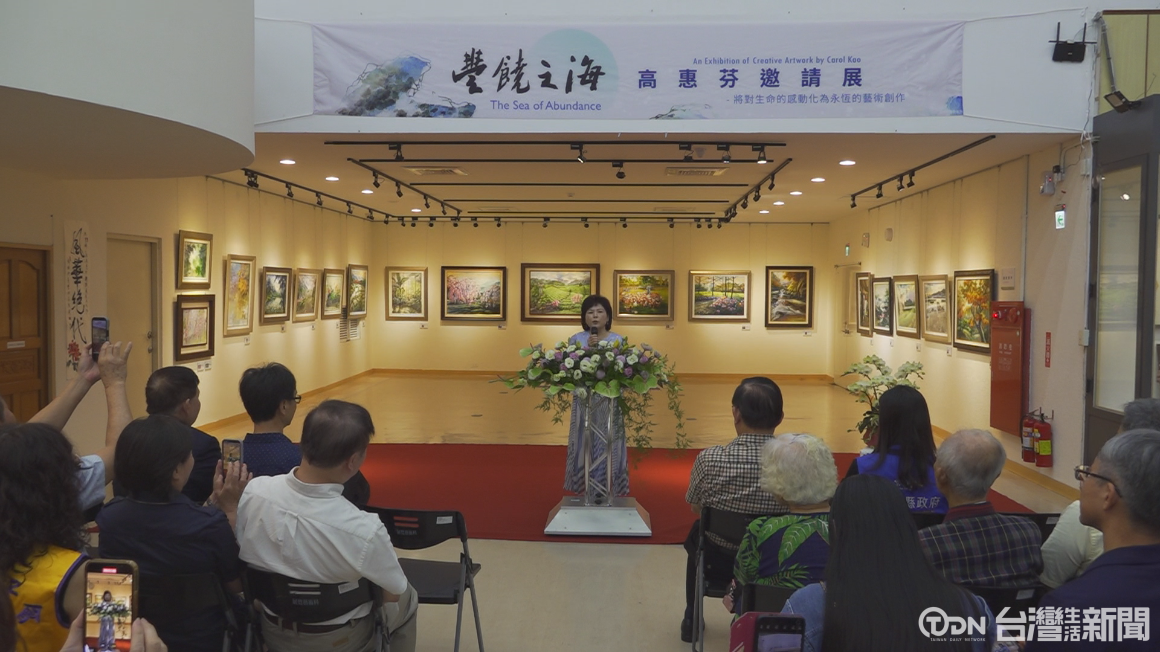 ▲雲林資深藝術家高惠芬,舉辦「豐饒之海」作品展覽,以「我愛雲林」、「海天遊蹤」、「彩墨有情」三大主題,完整呈現藝術家對家鄉山海、旅途景致與花鳥自然的深刻觀照。/記者 江儀 攝