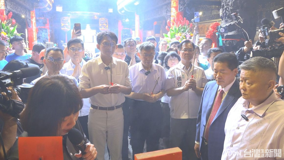 ▲前民眾黨主席柯文哲與現任黨主席黃國昌,率領自家黨代表一同手持清香,虔誠向媽祖參香/記者 陳柏翰攝