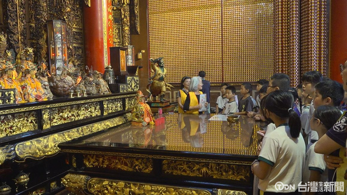▲小朋友們認真聽著志工媽媽的導覽,了解廟宇的歷史典故/記者 賴秋峰攝