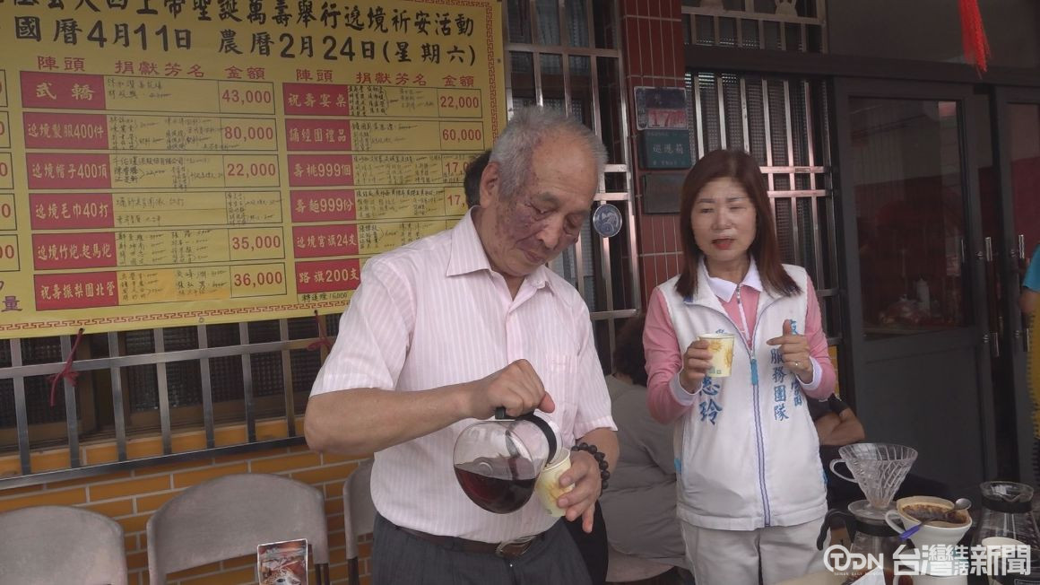 ▲古坑受山宮奉祀玄天四上帝,是永光、桂林、華山等古坑淺山地區的重要信仰之一,日前慶祝四帝爺公聖誕,辦理一系列活動,聖誕當日,除了作戲、吃平安餐,同時也邀請華山得過史懷哲貢獻獎的咖啡業者張景科到場,準備咖啡、咖啡醋,以及他研發的綠咖啡,讓信眾享用 / 記者 王可萱 攝