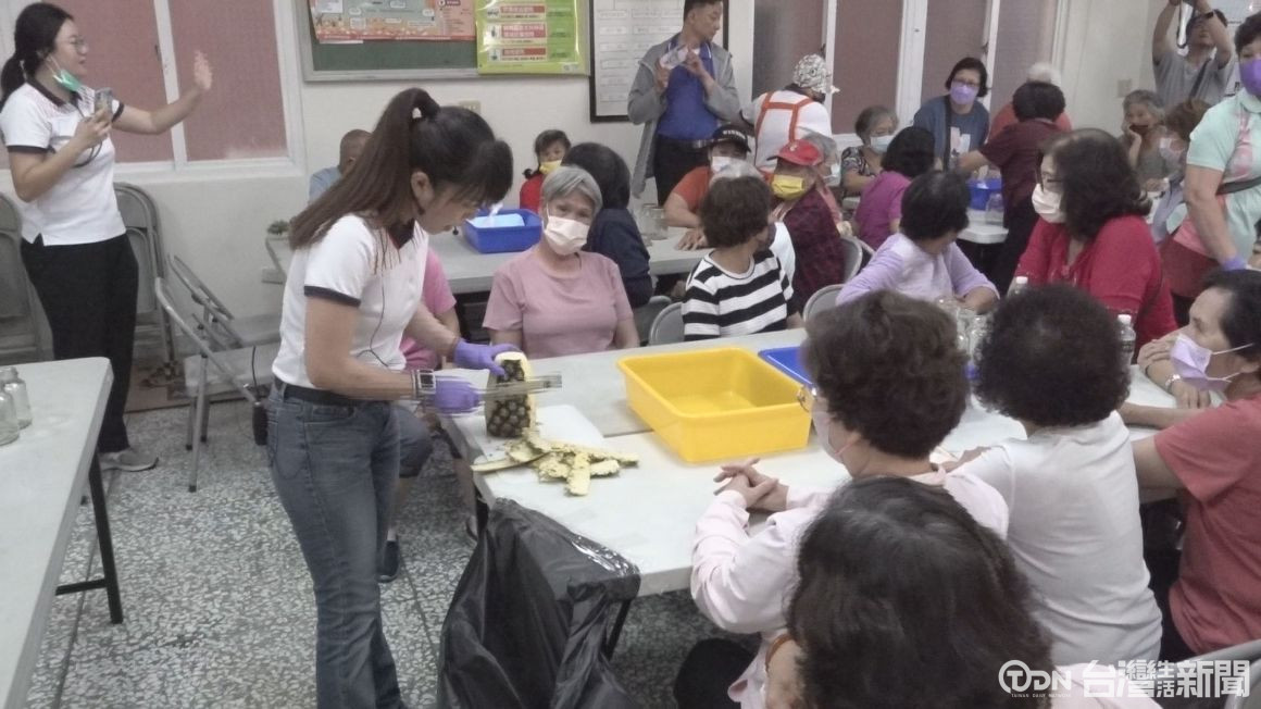 ▲山上區農會展示多項鳳梨加工產品,並帶領社區民眾動手製作鳳梨醬料。/記者 蕭建緯攝