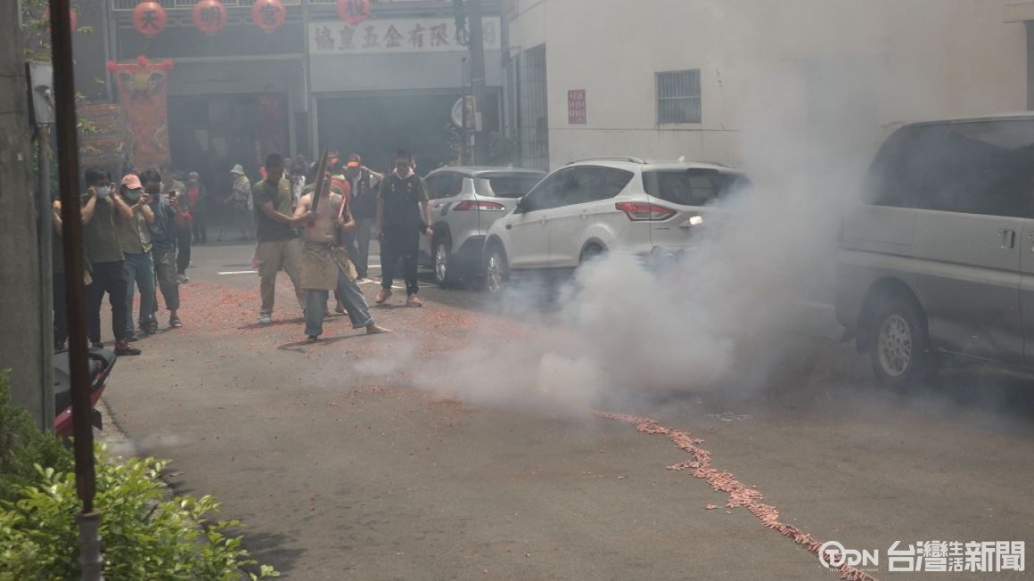 ▲鞭炮開路,象徵帝爺公來到。/記者 周有勝 攝