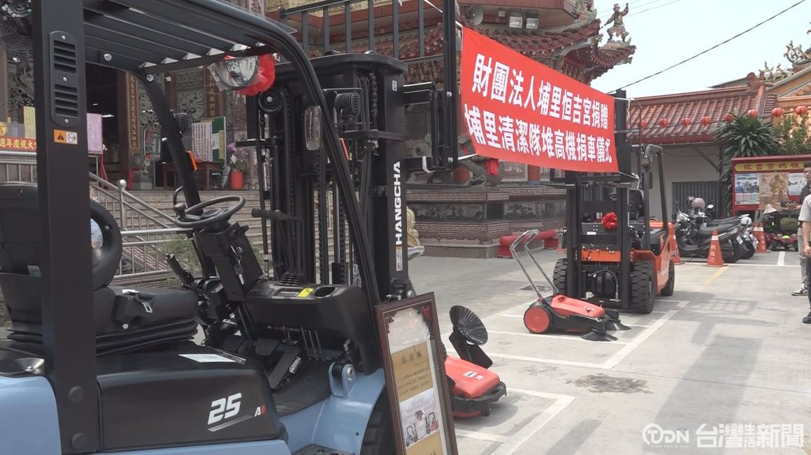 ▲埔里鎮恆吉宮,捐贈兩輛堆高機給清潔隊,鎮長廖志城(右二)代表接受。/記者 王昭聖 攝