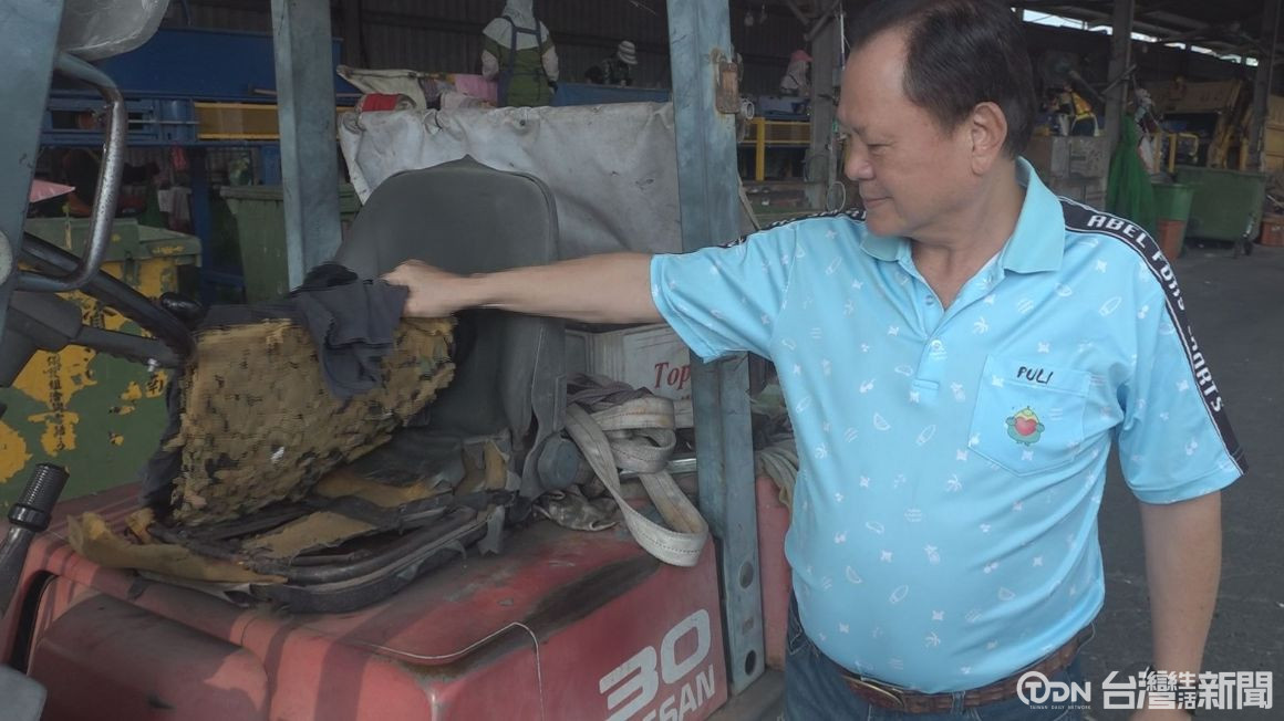 ▲老舊堆高機,駕駛座墊已經破爛不堪,機具維修費用更讓清潔隊難以負荷。/記者 王昭聖 攝