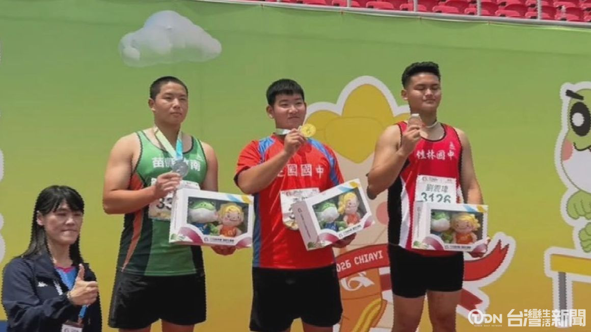 ▲全國中等學校運動會本周在嘉義舉行,代表雲林參加鉛球項目的北港建國國中學生李健嘉(中),在比賽中投出17.77公尺的成績,打破2023年大會紀錄。/畫面由建國國中提供。