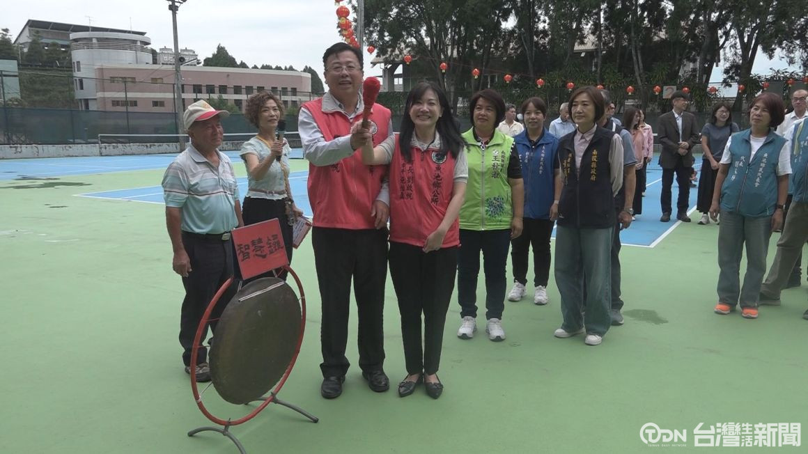 ▲魚池鄉長劉啟帆伉儷率領師生敲響智慧鑼/記者 范宏坤 攝