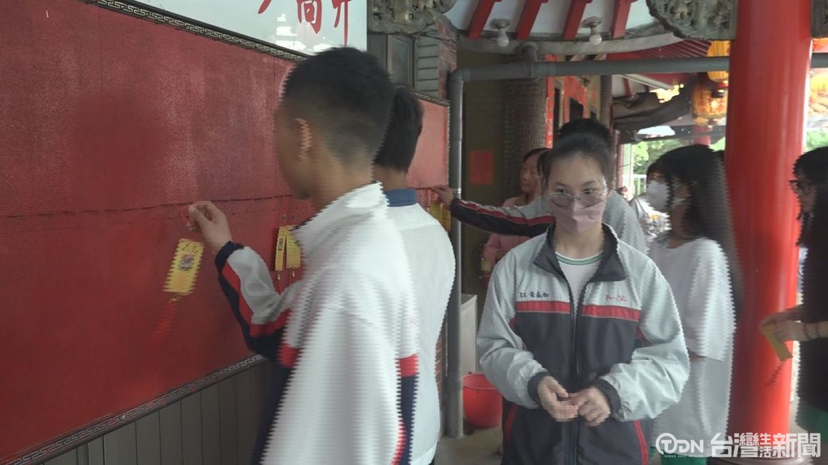 ▲考生將心願寫在祈福卡,並且掛在牆壁上,希望神明開智慧、考運順利/記者 范宏坤 攝