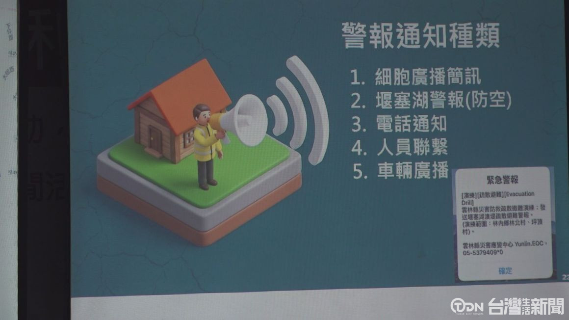 另外民政處的委託單位特別指出,因為怕5月8號林內堰塞湖災害疏散演練,發布的警報會造成民眾恐慌,他們將事先發送手機細胞訊息做提醒,請有收到的民眾多加留意。