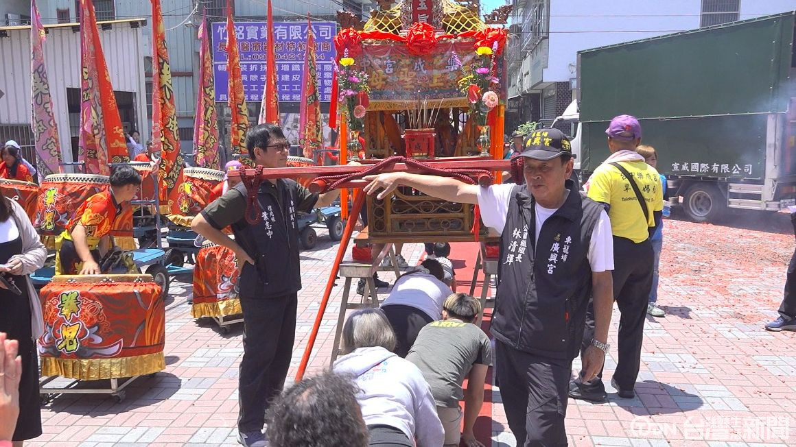 鞭炮聲響不絕於耳,千里眼順風耳在廟埕像廣興宮神明致意,緊接著廣興宮、喀哩新南宮、樂成宮媽祖鑾轎依序抵達,三進三退後將神尊請入廟內安座,每年駐駕廣興宮會特別安排鑽轎底活動,今年也不例外。