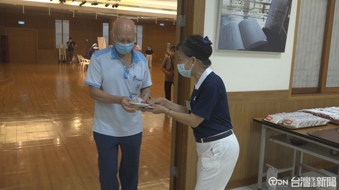 ▲慈濟志工發放平安御守和豆漿粉給施打的民眾/記者徐旻鈺 攝